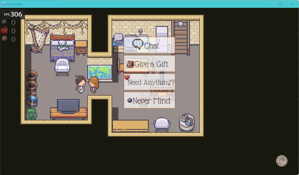 I added the bare bones of an interaction system. I don’t love it so I will change how it looks later but this is good enough for now. None of the selections are functional yet but it is all set up. I just have to put in what they will do in the future.