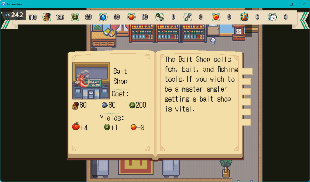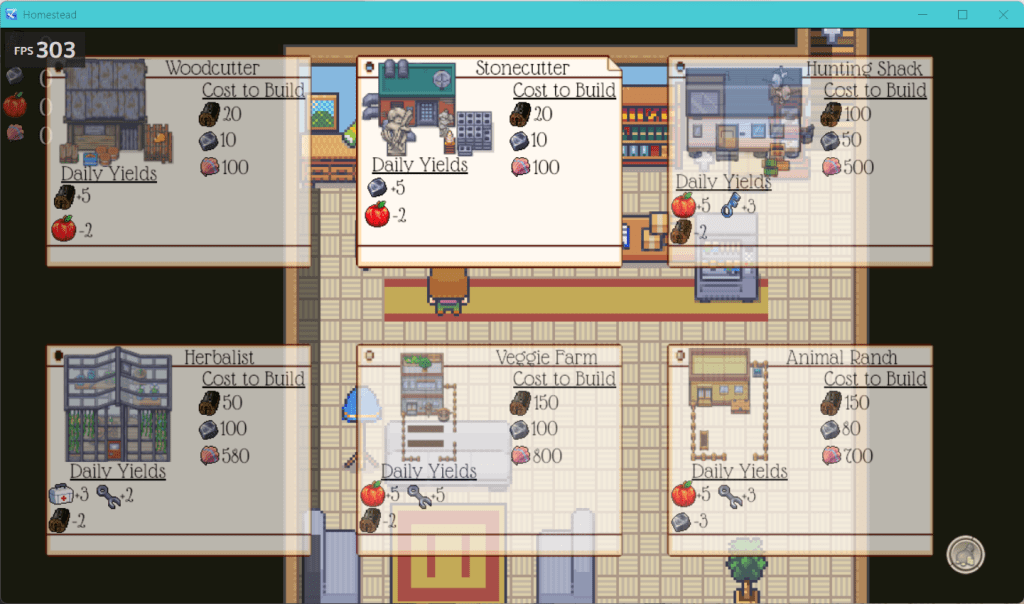 I had a four day weekend which has allowed me to make some progress on Homestead. I finished re-doing the building purchase menus. It took longer than I expected and the art isn’t 100% but… Read more